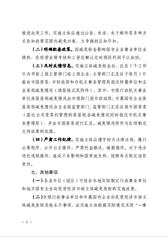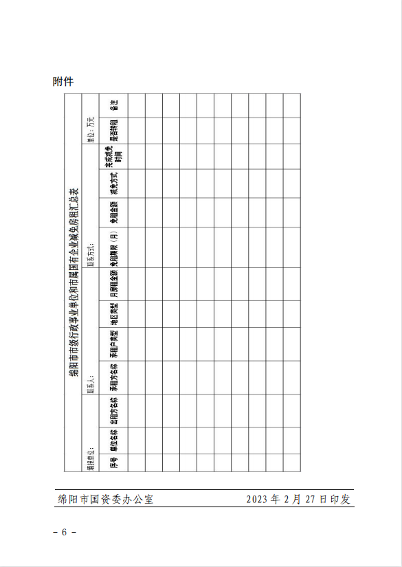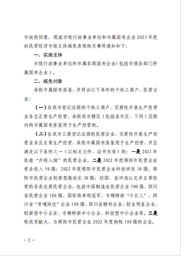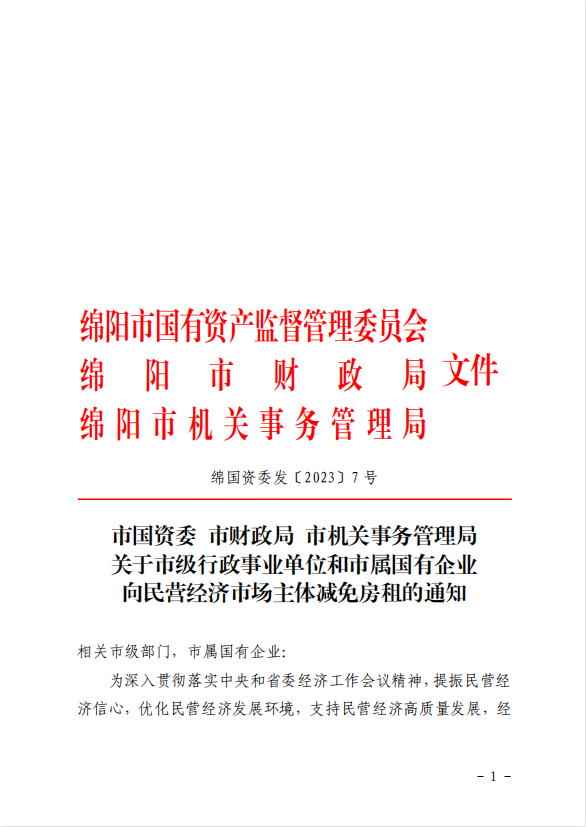 關(guān)于市級(jí)行政事業(yè)單位和市屬?lài)?guó)有企業(yè)民營(yíng)經(jīng)濟(jì)市場(chǎng)主體減免房租的通知 (綿國(guó)資委發(fā)[2023] 7號(hào))