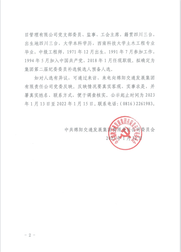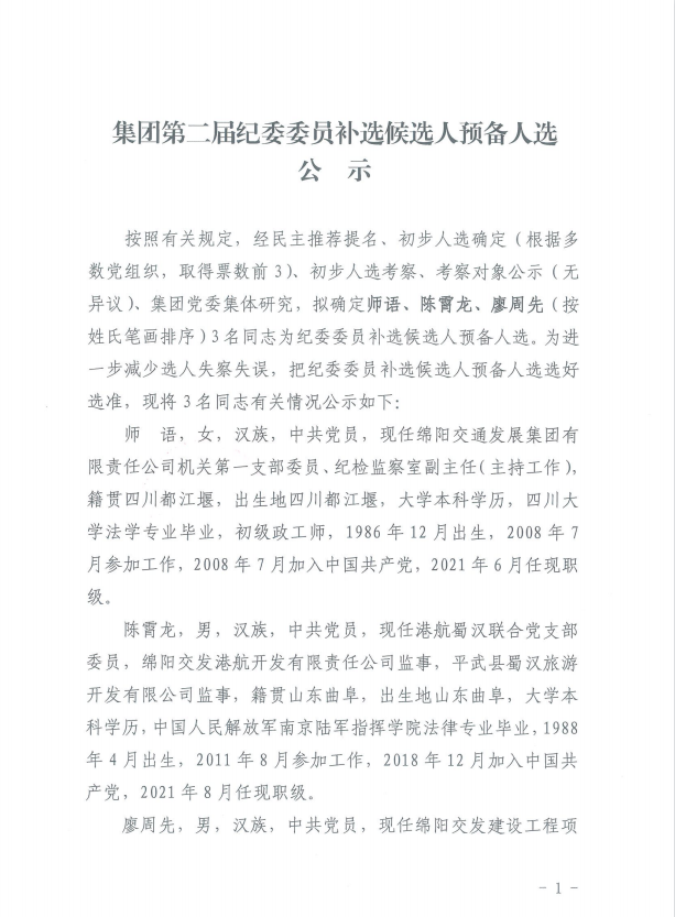 中拱綿陽交通發(fā)展集團有限責任公司委員會<關于進行集團第二屆紀委委員補選候選人預備人選公示的通知>